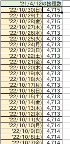 本日10/30(日) 08:08、summary_by_date.csv更新されました。今日の4/12は4,715だそうです。https://data.vrs.digital.go.jp/vaccination/opendata/latest/summary_by_date.csvhttps://www.kantei.go.jp/jp/content/vaccination_data5.xlsx全国のワクチンの接…